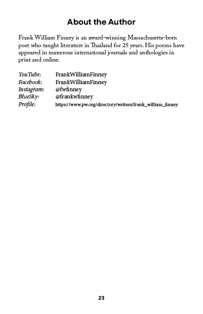Birds in a Boneyard presents twenty-one poems that navigate the shadowed corners of memory and mortality with unflinching honesty. Frank William Finney draws readers into landscapes where ravens perch on tombstones, abandoned chicken coops dot wooded hillsides, and the natural world bears witness to human frailty. These verses move between intimate domestic moments—morning coffee, autumn leaf-raking, feeding backyard hens—and darker territories of loss, disappointment, and the relentless passage of time. With a gothic sensibility that finds beauty in decay and meaning in transience, Finney's poetry invites readers to discover their own reflections in his contemplations of what remains when the familiar world shifts and fades around us.